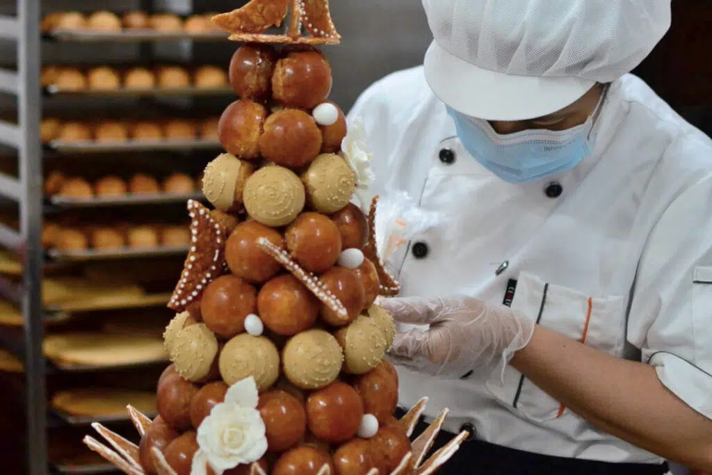 We have been making cream puffs for 10 years and we just keep improving ever since. Cream puff is the heart of a croquembouche, therefore we make it with great importance to our product. Our cream puffs are treated with precision when it comes to its ingredients and the dough of each pastry puff enters the oven evenly and comes out beautiful and round. The puff pastry have this light crunch and soft texture. Our cream filling is a diplomat cream which is made of both custard cream and whipped cream. This adds a whole new different texture to the cream with more richness and balance in flavor.