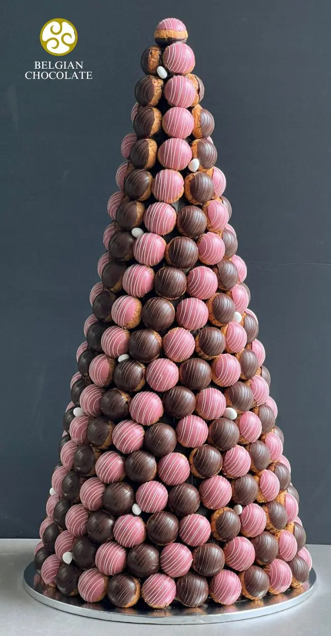 Your next party cake is here! Our biggest croquembouche yet, has an approximate 250-pieces of cream puffs coated with the Dark and Ruby Belgian chocolates from Callebaut. Each cream puff is filled with soft diplomat cream and topped with almond dragees. The best option for your next major event’s centerpiece cake!