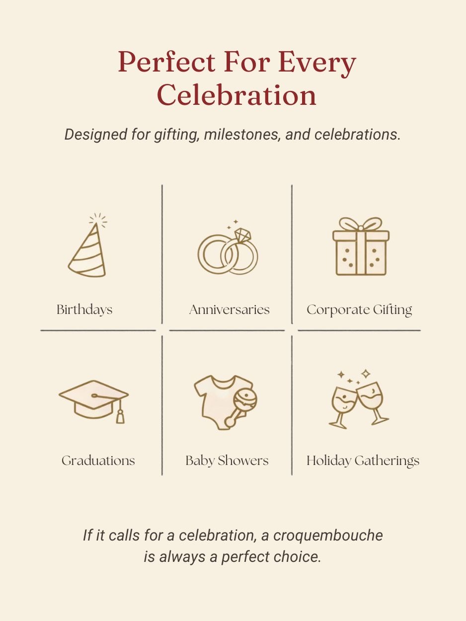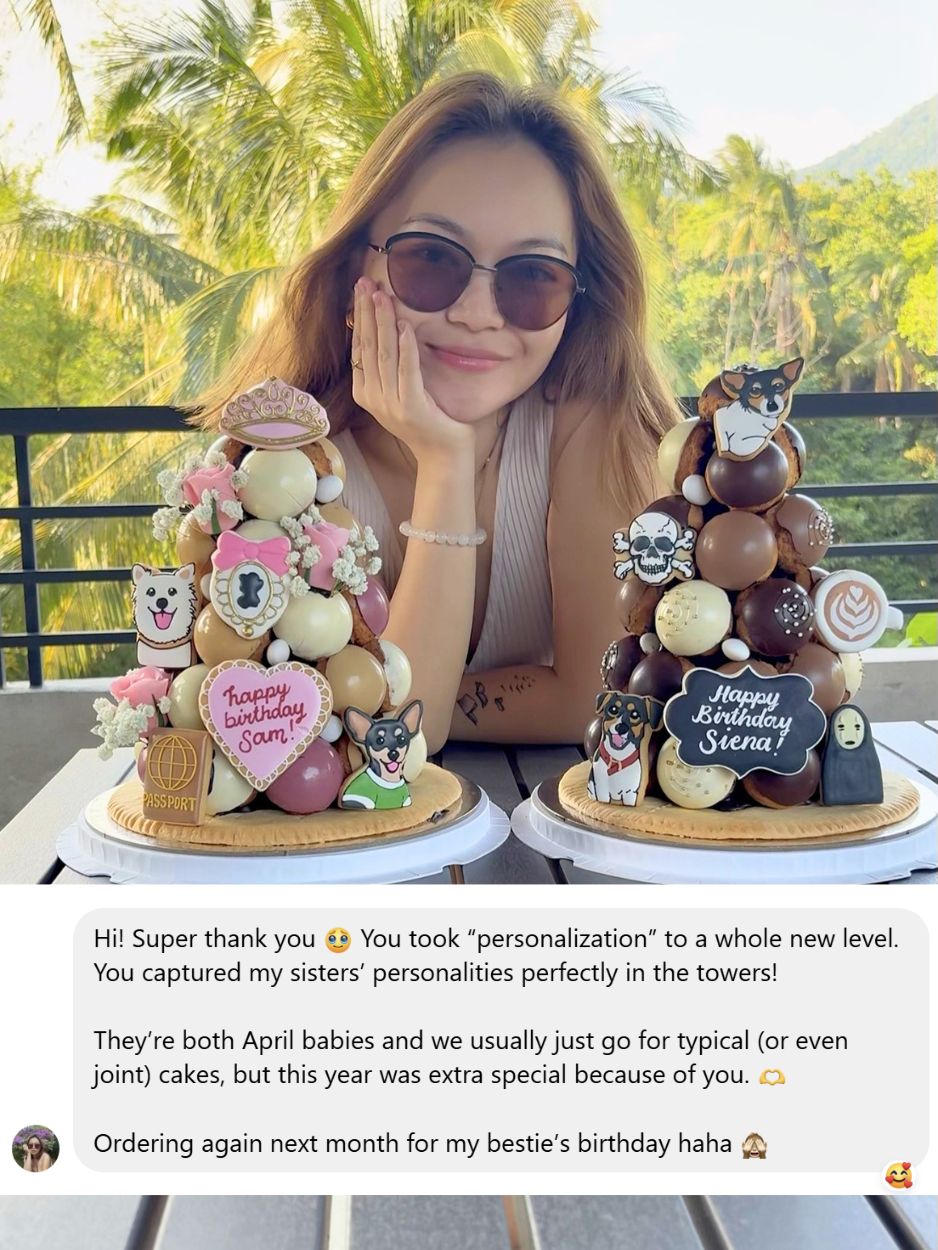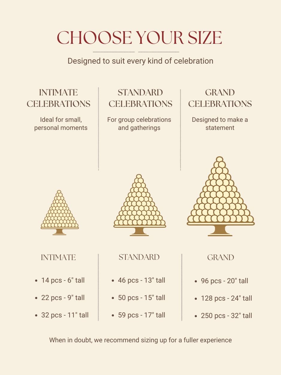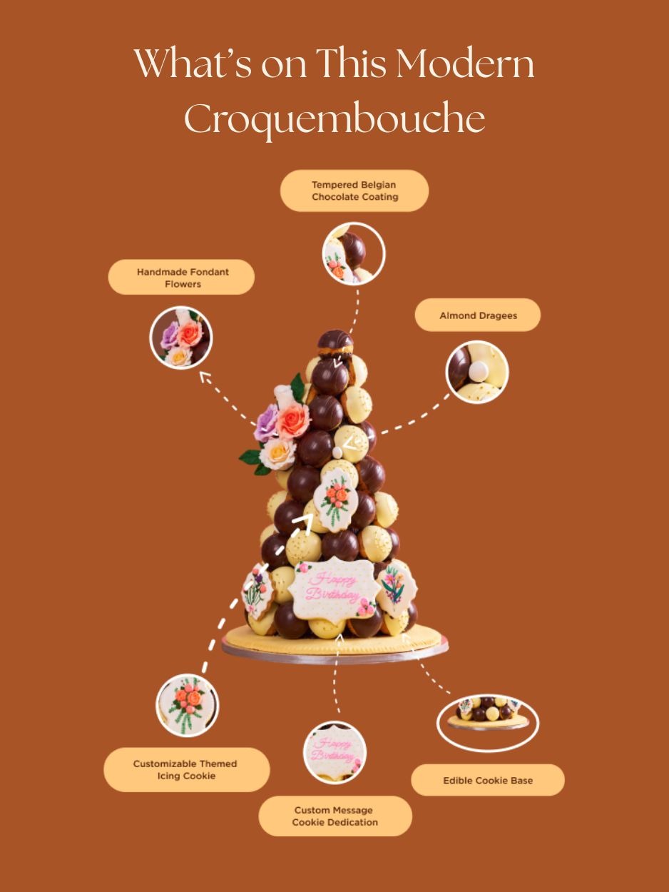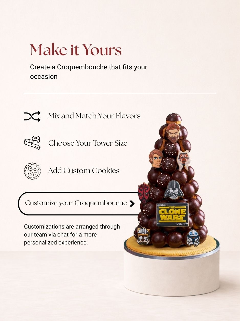 Every croquembouche can be customized uniquely for you. Major options are mainly custom icing cookies drawings and cookie dedication messages. Click here to know more about how to customize your own croquembouche