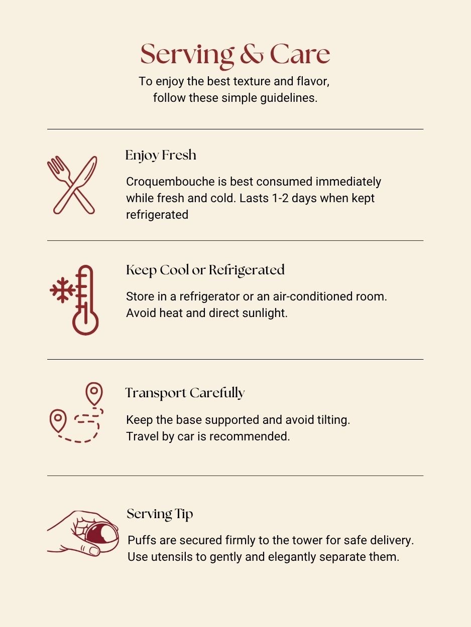 Croquembouche is best consumed when it is served cold or chilled. To ensure the freshness of its taste and texture, keep the croquembouche refrigerated or stored in an air-conditioned room before consumption.Â