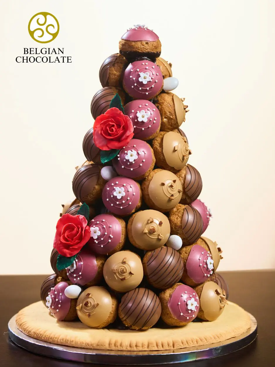 This approximately 50-piece croquembouche is a play of flavors from milk, ruby, and gold Belgian chocolate flavors. A milky, fruity, and toffee combination . Each cream puff is filled with diplomat cream and is topped with almond dragees and two fondant flowers.