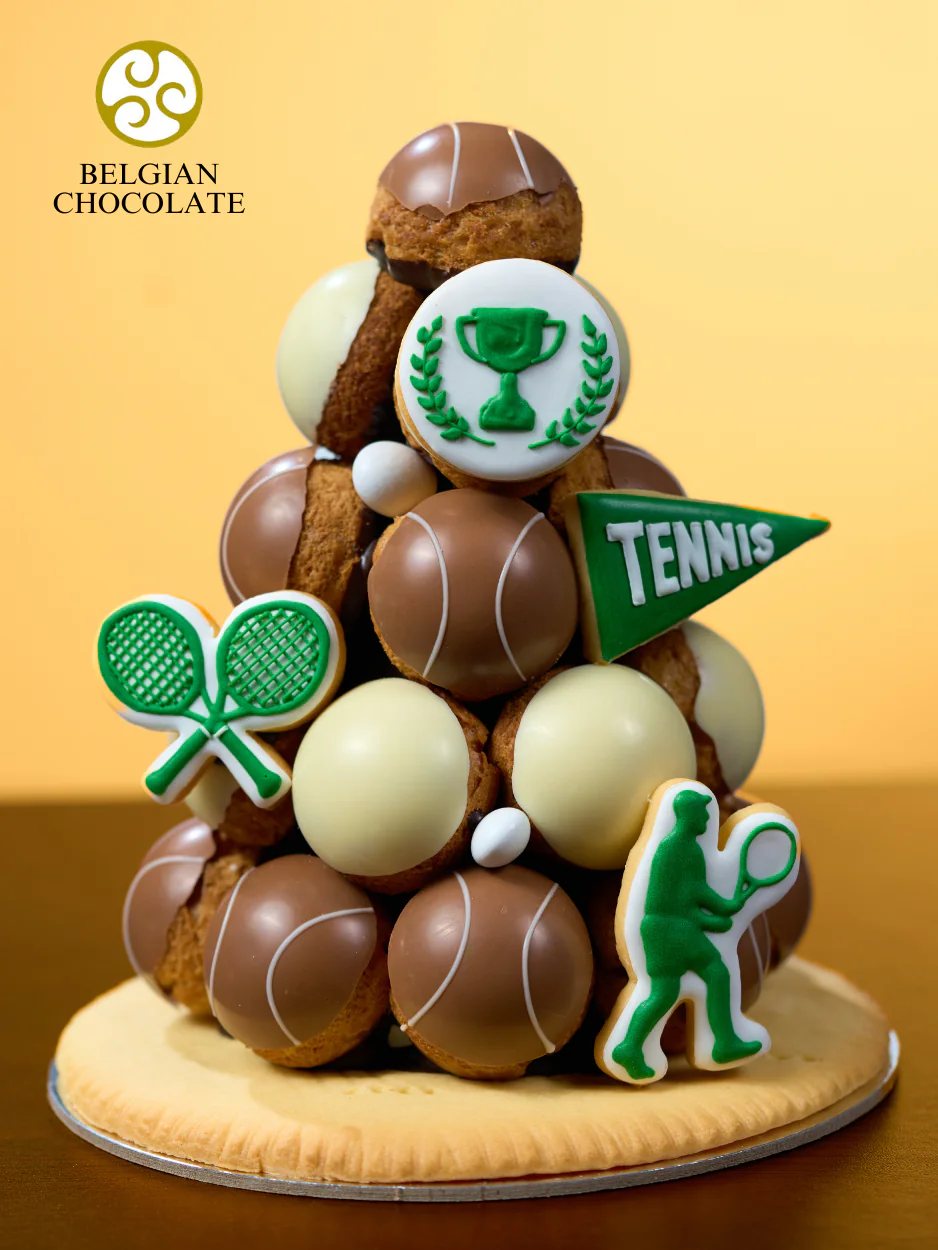A Tennis player will love this croquembouche. The tower consist of approximately 22pcs of cream puffs coated with Milk and White Belgian chocolate all tempered to finish and filled with a diplomat cream filling. The croquembouche is topped with almond dragees and Tennis-themed icing cookies